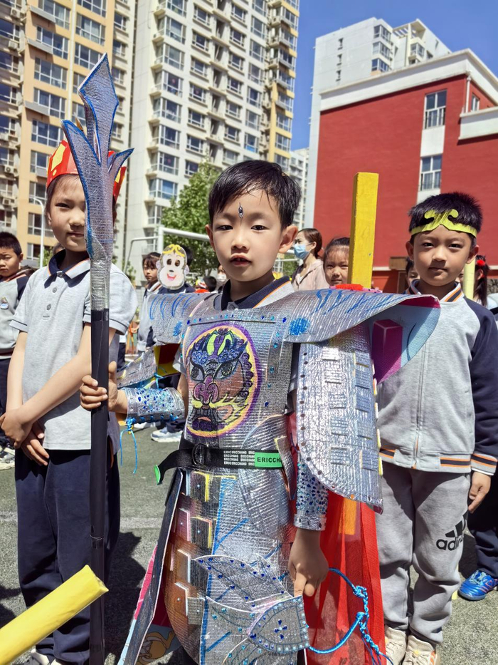 同学们纷纷穿戴好自己用环保材料设计制作的西游记人物头饰、服装,手持兵器兴高采烈地参加到各个班级举办的游戏活动中!这些游戏巧妙地将西游故事与语数英、音体美等学科相融合——“智取火焰山”“勇闯狮驼岭”“飞渡通天河”.......一个个充满乐趣的游戏激发着每一位同学的参与热情!热闹的操场仿佛成了一片仙境,各路神仙活跃其中!