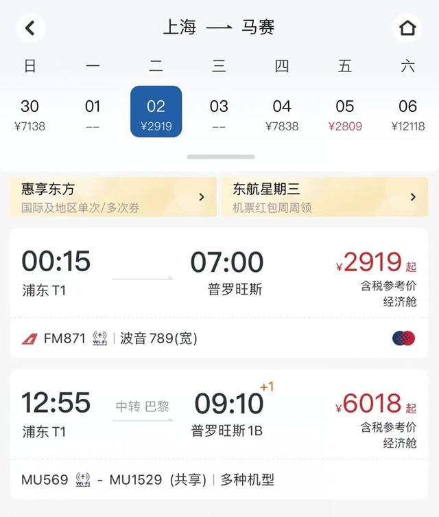 新开通的“上海—马赛”航线航班号为FM871/FM872,由东航旗下上海航空每周执行3班往返航班,逢周二、五、日执行,航程约12个小时。去程航班凌晨00:15从上海浦东国际机场起飞,07:00到达马赛普罗旺斯国际机场;回程航班10:55从马赛普罗旺斯国际机场起飞,次日05:00到达上海浦东国际机场(以上时刻均为当地时间)。由此,中法两座名城之间,告别了过去航程必须中转第三地的情形,有了更快捷便利的选择。