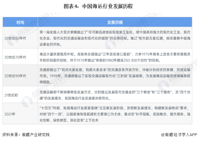 1949年10月1日,“海辽”轮升起五星红旗,标志着新中国海运事业的开始。近几十年来,中国海运行业自20世纪50年代发展至今已经经历70余年的历史。目前,我国海运行业已形成完整、合理的产业体系,整体来看中国海运发展历程可概括为以下五个阶段: