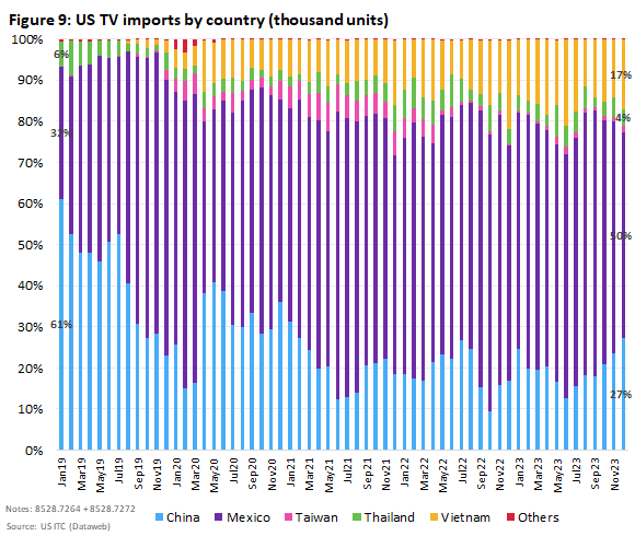 中国向美国出口电视数量的比例,已从2019年1月的61%下降到2023年11月的27%;而墨西哥向美国出口电视数量的比例,则从2019年1月的32.9%上升到2023年11月的50%;越南向美国出口电视数量的比例,也从2019年1月的0%上升到2023年11月的17%。