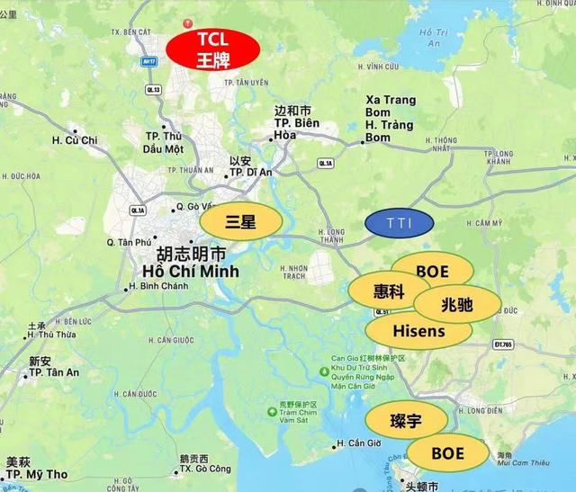 据中印越电子(手机)企业协会的最新统计,越南南部胡志明及周围已形成了以TV为主的家电产业集群,预计两年内越南南部TV年产能将达4000万台,产业主要聚集在胡志明、同奈、平阳、头顿等地。其中,三星工厂年产1100万台,TCL工厂年产650万台,惠科工厂年产300万台,兆驰工厂年产300万台,BOE高创工厂年产200万台,BOE新项目年产300万台,璨宇(中国台湾企业)工厂年产400万台,此外,海信据说也有设厂计划。