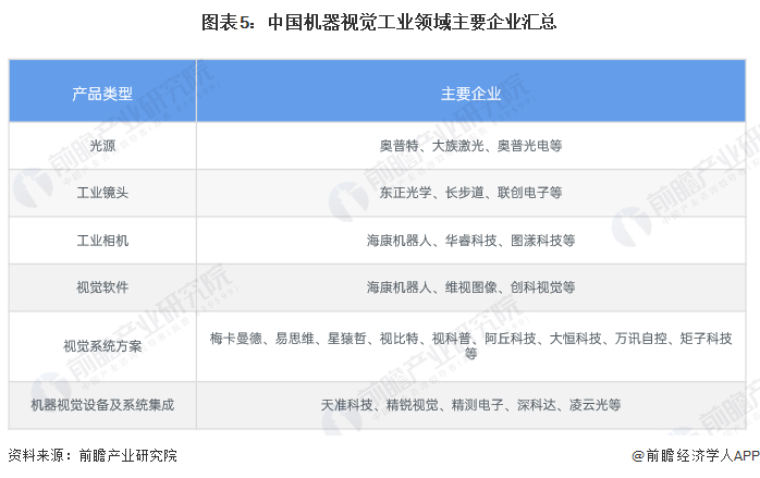 目前,机器视觉设备制造商中,天准科技、矩子科技和美亚光电的等展现出较强的市场竞争力,机器视觉系统集成商的代表企业包括凌云光、精测电子等,机器视觉系统解决方案代表企业有梅卡曼德、阿丘科技等。机器视觉产业链上游硬件领域中,联创电子、海康机器人、奥普特、北京君正分别为光学镜头、工业相机、光源设备和图像处理领域的典型厂商。