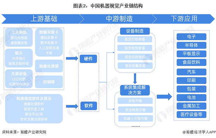 机器视觉行业的上游有光源、镜头、工业相机、图像采集卡、机器视觉软件等的提供商。行业下游应用较广,主要下游市场是半导体和电子制造行业。除此之外还有应用到汽车、印刷包装、农业、医疗设备和金属加工等领域。