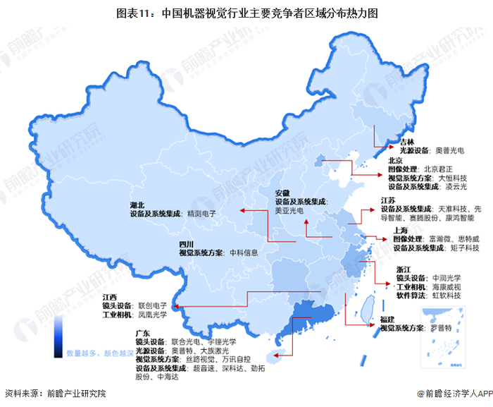 从中国机器视觉行业主要竞争者的区域分布来看,中国机器视觉厂商主要分布在南方地区,其中以广东最为集中,奥普特、劲拓股份等业内上市企业均位于广东深圳;其次,北京和浙江地区也是机器视觉企业分布较为集中的地区,代表企业有海康机器人、凌云光等。