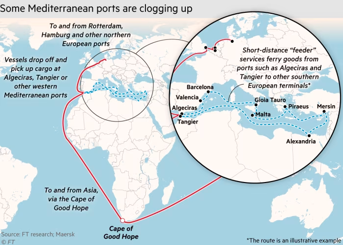 但如今,在大量亚欧航线上的船只被迫绕行南非好望角后,许多已经经历了旷日持久航线旅程的船只,往往会选择将集装箱放在地中海西侧的港口,随后相关方再通过联系短途“支线船”(feeder ship)服务,将货物运送到其他南欧码头。