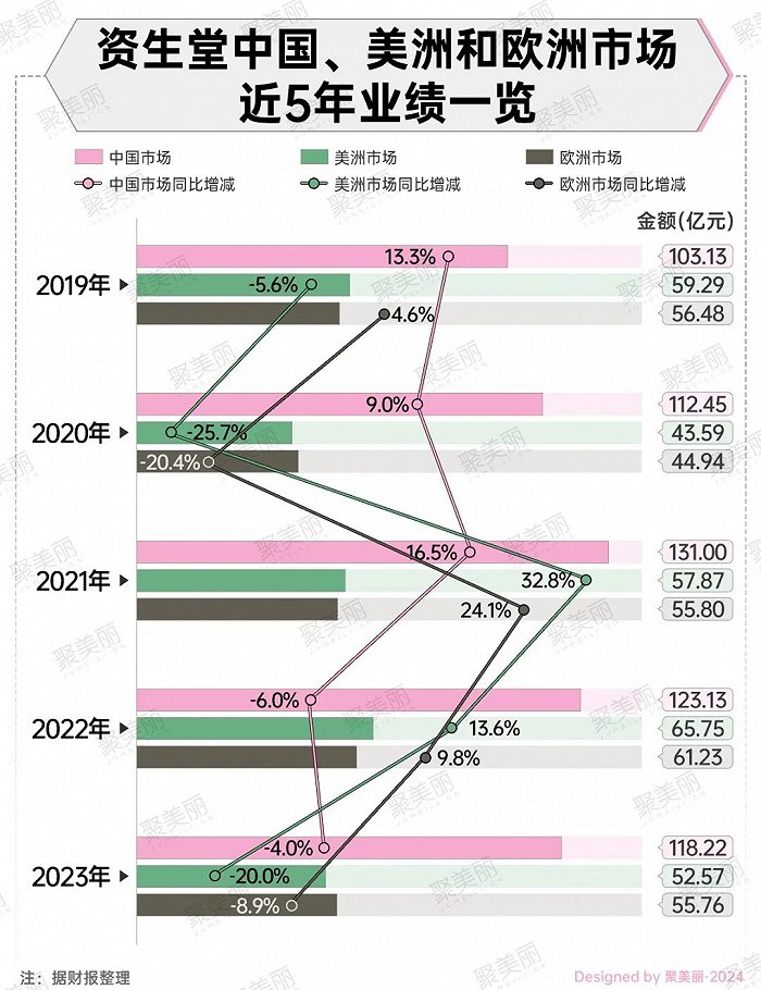 然而,资生堂在中国市场经历了2019-2021年的高光时刻后,在2023年同比下滑4%。加之,2023年资生堂在美洲、欧洲市场销售均下跌,导致海外主要市场全线溃败。