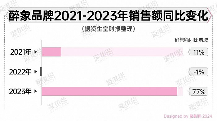 在资生堂的扩张战略下,醉象仍保持增长势头,2021年-2023年间,除2022年销售额下滑1%外,其余均呈双位数增长,且2023年涨幅达77%。
