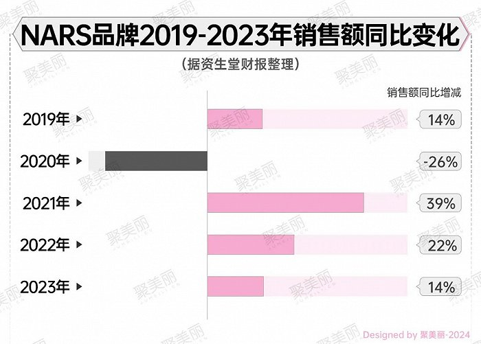 NARS不仅在中国(注:资生堂第一大海外市场)表现强劲,而且除2020年外,近5年销售额,均保持双位数增长,其中2021年涨幅达39%。