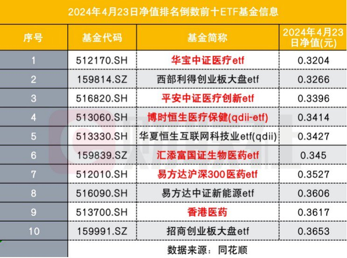 截至4月23日收盘,净值排名后十的ETF基金中,6只为医药或医疗主题的ETF。其中,华宝中证医疗ETF净值排名倒数第一。该基金成立于2019年5月,截至4月23日,该基金单位净值为0.32。