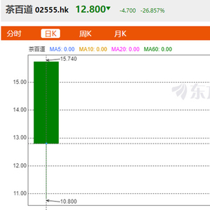 最终,茶百道敲响了港交所上市的钟声,成为继奈雪的茶后第二家上市的新式茶饮品牌。然而,上市首日,茶百道开盘即破发跌逾10%,随后持续走低,跌幅于午后有小幅收窄,盘中跌幅一度达35.2%,当日股价最终收于12.8港元,跌幅26.86%,市值189.1亿港元,较发行市值蒸发近70亿港元。