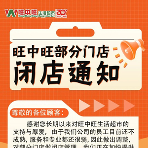 即将关闭的门店包括旺中旺生活超市新溪店(428闭店)、福州路体育馆店(5月7日闭店)、莲塘站前店(5月22日闭店)、站前路店(6月22日闭店)。