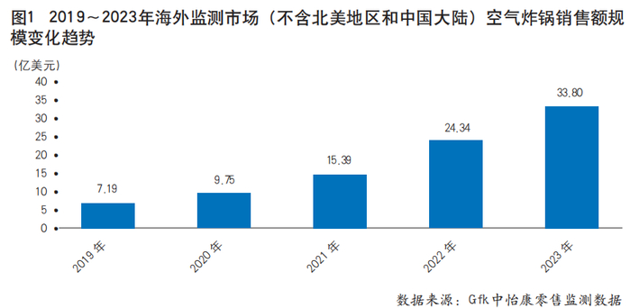 以海外监测市场(不含北美地区和中国大陆)为例,2023年空气炸锅销售额同比增长约39%,达到33.8亿美元(见图1),连续4年保持两位数增长,显著高于同期厨房小家电市场销售额整体水平。