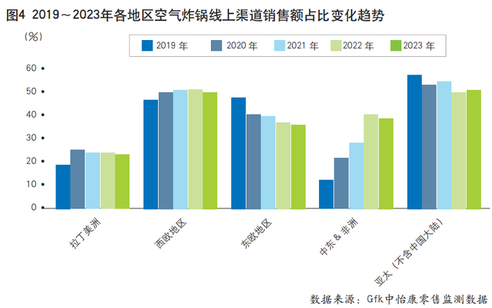 渠道方面,在海外监测市场(不含北美地区和中国大陆)中,空气炸锅双线市场近年来均保持稳健增长态势。2023年,空气炸锅线上市场与线下市场销售额同比分别增长36%和41%,达到13.6亿美元和20.2亿美元。在海外市场,空气炸锅产品消费仍明显集中于线下渠道,线上终端出货额占比维持在40%左右,其中2023年比重略有下滑。同时,各地区的渠道表现也存在差异(见图4)。其中,西欧与亚太(不含中国大陆)地区的线上市场消费占比相对较高,而拉美等其他地区更偏重于线下市场。