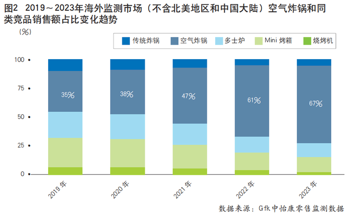 从市场份额表现来看,空气炸锅对比其他使用场景单一的小家电,例如多士炉、Mini烤箱、烧烤机等产品,份额挤占效应愈发明显。其中,2023年在综合上述产品的整体市场中,空气炸锅份额占比达到67%,对比2019年的份额占比涨幅接近1倍(见图2)。