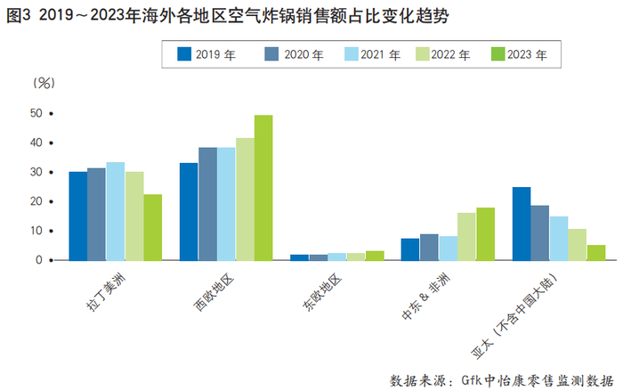 相比之下,拉美地区与亚太(不含中国大陆)地区增速逐步减缓。2023年,亚太(不含中国大陆)地区空气炸锅销售额同比下降8%,份额占比缩减至6%。