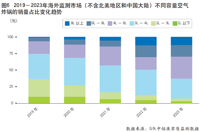 二是大容量产品出货占比持续提升。近年来,消费者对空气炸锅产品认可度不断提升,烹饪频次以及处理食物种类的持续增加,进一步驱动了产品规格向更大容量迭代。越来越多的厂商加快推出容量更大的空气炸锅,以满足日益增长的家庭消费需求。在海外监测市场(不含北美地区和中国大陆)中,4L以上容量的空气炸锅正在逐渐成为主流(见图6)。其中,6L~8L以及8L以上的产品销量占比在2023年分别提升了6个百分点和4个百分点,达到17%和12%,其对应的SKU数量在近2年的复合增速分别高达114%和56%。此外,从不同容量规格产品的市场均价变化中可以看出,2019年以来,容量8L以上产品的价格呈现持续走高态势。这类产品在市场中表现出良好的需求韧性。因此,大容量趋势既充分反映出消费者对于更大烹饪容量以及更多选择的需求,也促使产品在多元化的应用场景中发挥作用,为用户带来更多便利和灵活性。