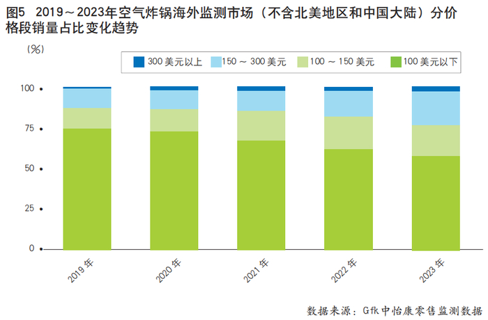 一是产品高端化趋势愈发明显。基于人们对健康生活方式的理解和对高品质家电的追求不断升级,空气炸锅的定价也呈现日益高端化的趋势。虽然在当前海外监测市场(不含北美地区和中国大陆)中空气炸锅的产品定价主要集中在100美元以内,但从价格段结构来看,100美元以上的中高端产品销量占比已呈现逐年提升态势(见图5)。