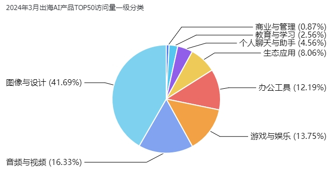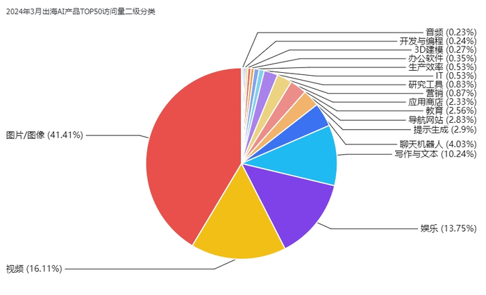 在2024年3月的出海AI产品市场分析中,我们观察到图像设计类工具以41.69%的访问量占比显著领先,这一数据凸显了海外用户对于高质量图像编辑和设计工具的强烈需求。这类工具通常集成了先进的AI技术,如图像识别、风格迁移和自动排版等功能,使得用户即使不具备专业设计背景也能轻松创作出引人注目的视觉内容。图像设计类工具的普及不仅促进了创意产业的发展,也为个人和企业用户提供了强大的自我表达和品牌推广的手段。