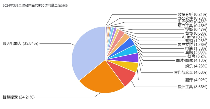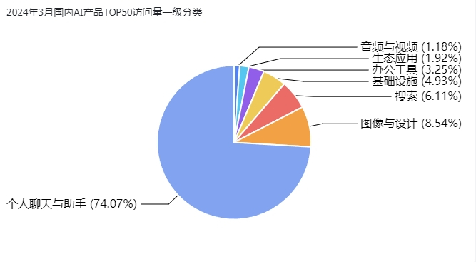 根据2024年3月全球AI产品访问量数据,我们可以看到不同一级类目的访问量分布情况。