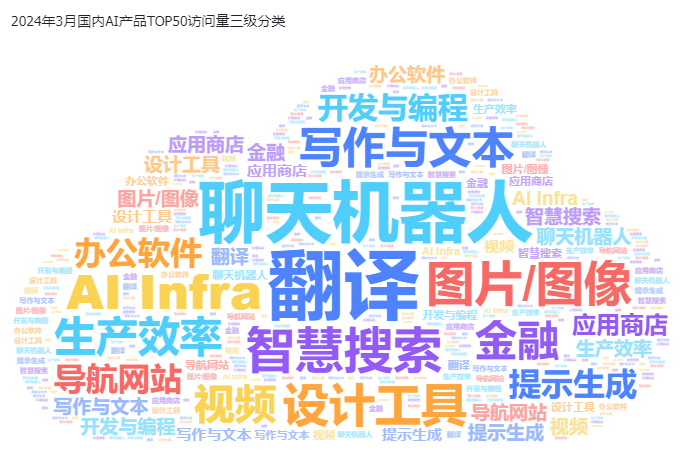 国内AI产品访问量TOP50中所涉及到了18个应用类别。其中翻译、聊天机器人、智慧搜索、AI Infra、图片/图像,在3月成为最常被用户使用的应用。
