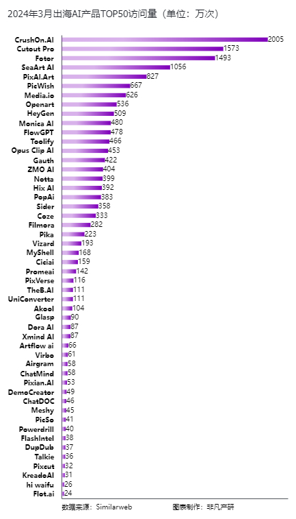 数据经整理分析可以发现,在2024年3月,出海AI产品的访问量数据显示出明显的分布特征。在月度报告中,CrushOn.AI以2005万次的访问量位居榜首,这一成绩凸显了其在情感陪伴领域的强大吸引力。紧跟其后的Cutout Pro和Fotor也都相比上月有所增加,月访问量分别达1573万次以及1493万次。
