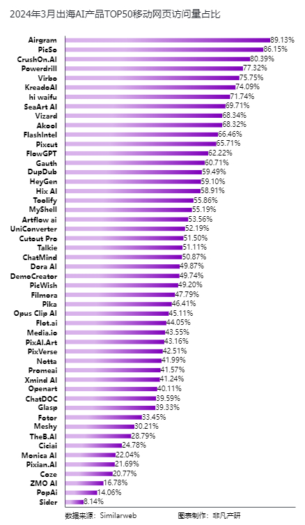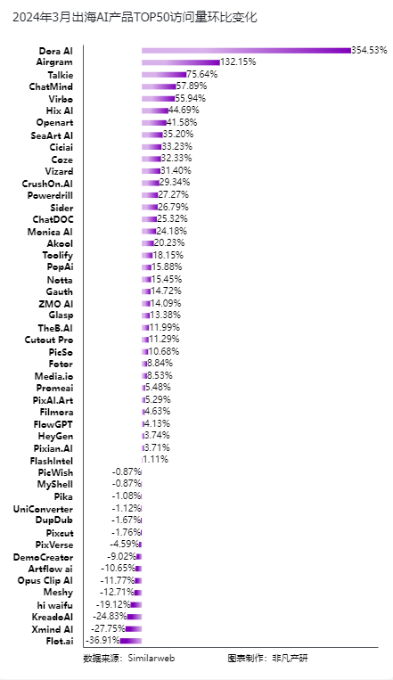 相比2024年2月,3月出海AI产品Top50中一共有35款出海产品实现流量环比增加,15款出海产品实现流量环比减少。环比增速最快的应用是Dora AI,环比增加354.53%,Dora AI提供了一个基于人工智能技术的无代码网站构建平台,它允许用户通过简单的文本描述来快速生成可编辑、可交互的网页设计稿。环比增速超过50%的还有Airgram、Talkie、ChatMind和Virbo,环比分别增加了132.15%、75.64%、57.89%、55.94%。
