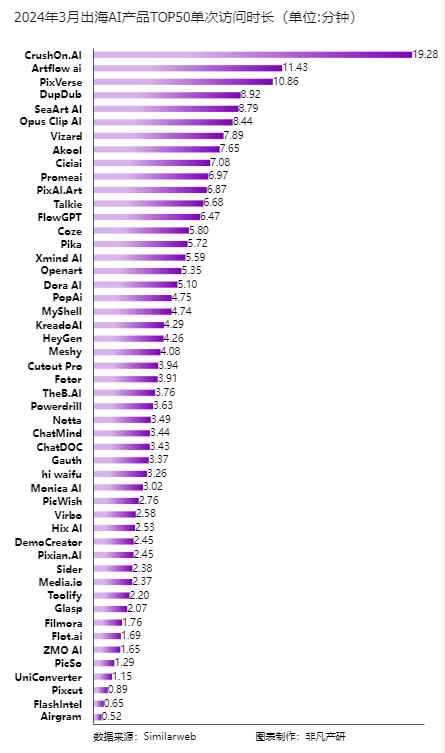 紧随CrushOn.AI之后的是小说生成产品Artflow和视频生成产品PixVerse,这两款产品的用户单次使用时长也都超过了10分钟。对于这类内容生成产品而言,用户在使用过程中往往需要投入更多的时间和精力来创作和完善作品。由于内容生成涉及到复杂的算法和大量的数据处理,因此需要消耗更多的算力和时间,这也是用户单次使用时长较长的一个重要原因。