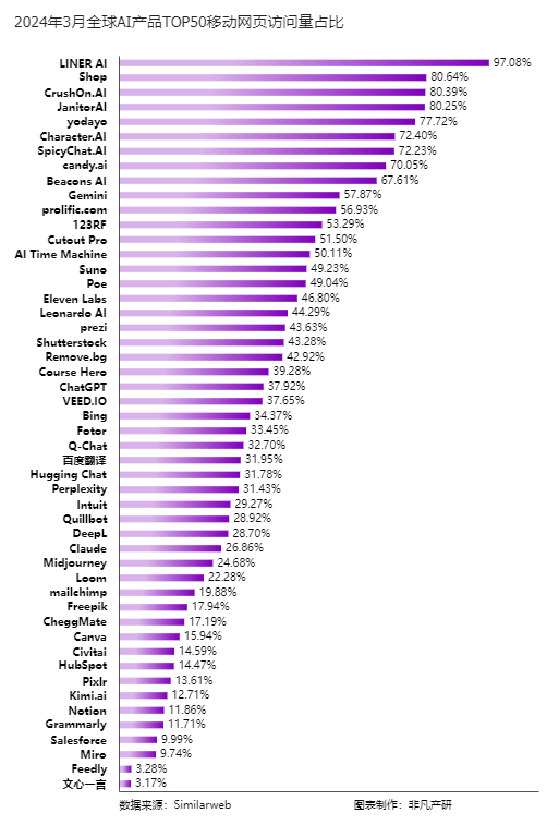 我们看到社交和电商类AI应用,如LINER AI和SHOP,其在3月的移动端访问量占比分别达到了97.08%和80.64%,这表明用户在社交互动和电商购物方面更倾向于使用移动设备。Crushon.AI、yodayo、SpicyChat.AI作为社交聊天机器人,也有较高的移动端访问量占比,分别为80.39%、77.72%和72.23%,这进一步证实了移动社交在用户日常生活中的重要性。
