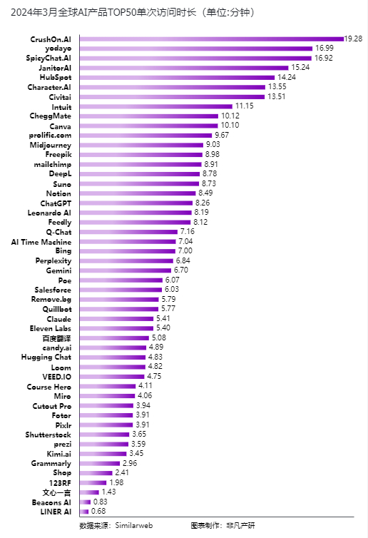 从2024年3月的全球AI产品单次访问时长来看,排名第一的是CrushOn.AI,单次平均访问时长达19.28分钟。CrushOn是一款主打情感陪伴的“AI伴侣”应用,以NSFW大火。应用内部存在不同声音、外貌、性格的角色,基于LLM定制个性化的聊天模式,用户可以与不同的二次元动漫角色对话聊天。与之类似的还有SpicyChat,3月占据了排行榜第三的位置,单次平均访问时长达16.92分钟。
