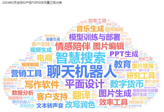 全球AI产品访问量TOP50中所涉及到了18个应用类别。其中聊天机器人、智慧搜索、翻译、平面设计,在3月成为最常被用户访问的应用。