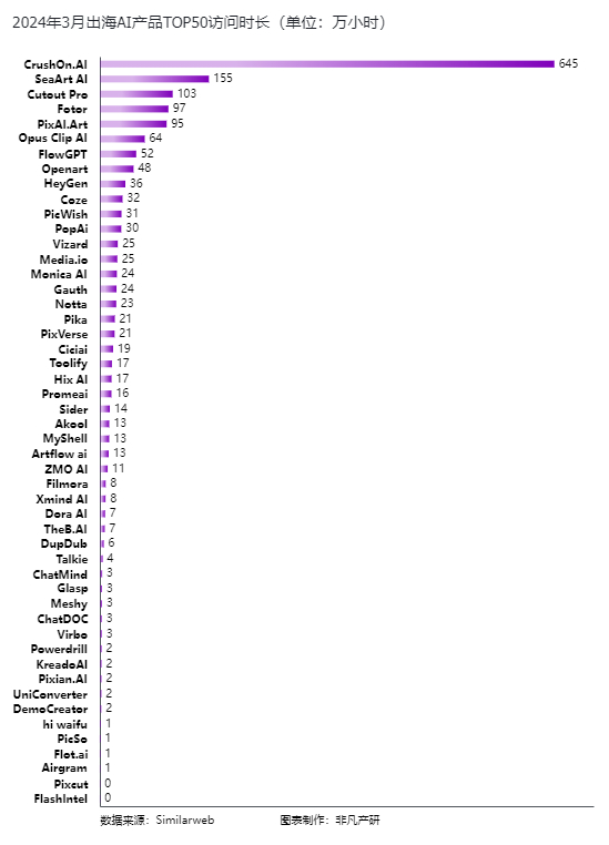 在2024年3月,中国出海AI产品在全球市场上的表现呈现出了不同层次的用户参与度。根据最新的访问时长数据,我们可以看到,CrushOn.AI在榜单中一骑绝尘,通过定制化的情感陪伴服务,收获了用户645万小时的青睐。其他比较高的产品则基本集中在图片、视频编辑处理方向。