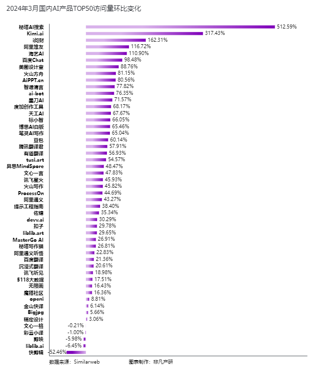 环比变化是衡量产品市场表现和用户接受度的重要指标,它反映了产品在短期内的市场动态和发展趋势。在国内AI产品环比变化方面,秘塔AI搜索和Kimi.ai均有显著增长,分别达到了512.59%和317.43%,彰显了国内C端AI应用市场巨大的发展潜力。增速过倍的AI应用还有同花顺i问财、阿里堆友、海艺AI,其增速分别达到了162.31%、116.72%和110.90%。