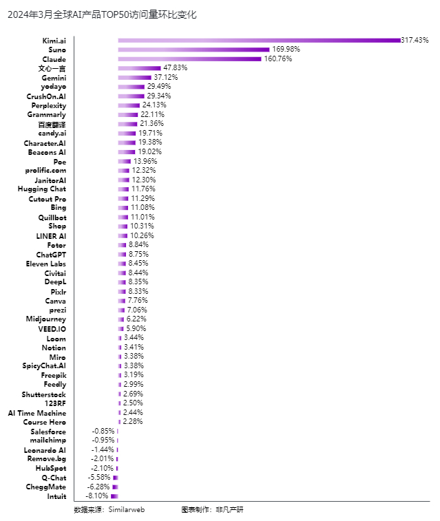 2024年3月的全球TOP50 AI产品访问量变化方面,增长最快的是Kimi.ai,一款来自国内清华系的创业公司月之暗面(Moonshot AI)开发的人工智能助手,月环比增长317.43%。作为一款聊天机器人产品,Kimi不仅能够处理和解析多种文件格式,如TXT、PDF、Word文档、PPT幻灯片和Excel电子表格等,以满足用户在不同场景下的需求。同时也具备对互联网内容的访问和解析能力,可以阅读和理解网页内容,为用户提供更加丰富和全面的信息。