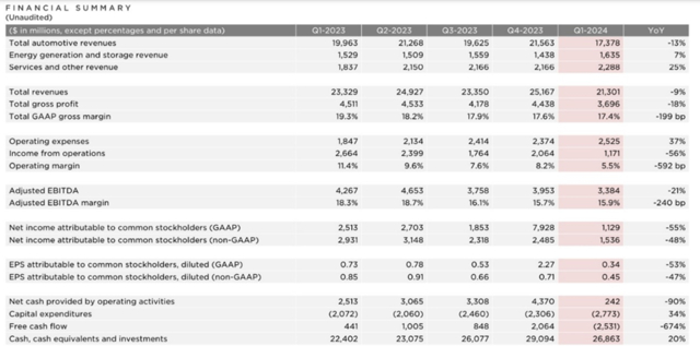 4月24日早,特斯拉发布2024年第一季度业绩。