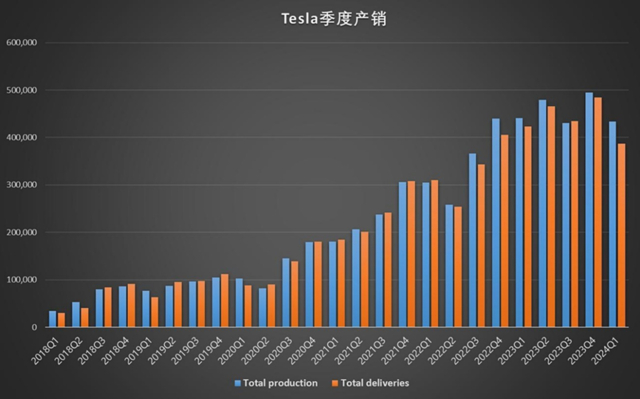 今年一季度,特斯拉的全球交付量为38.7万辆,同比降低8.5%,环比降低20.2%;产量为43.3万辆,同比降低1.7%,环比降低12.4%,这是特斯拉历史上首次遭遇产销量的同环比双降。