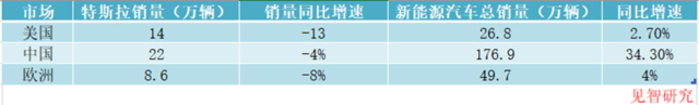 此外值得注意的是,在中国、美国和欧洲的新能源汽车总体销量依旧保持正增长的同时,特斯拉却在三大新能源汽车市场上同步遭受“滑铁卢”。