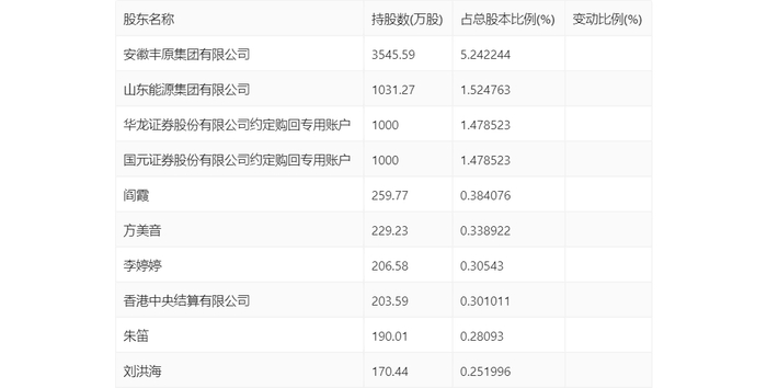 一季报显示,2024年一季度末公司十大流通股东中,新进股东为香港中央结算有限公司、刘洪海,取代了上年末的王丽华、姜德龙。在具体持股比例上,安徽丰原集团有限公司、山东能源集团有限公司、华龙证券股份有限公司约定购回专用账户、国元证券股份有限公司约定购回专用账户、阎霞、方美音、李婷婷、朱笛持股有所下降。