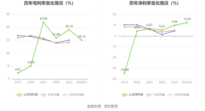 2024年第一季度,公司毛利率为30.14%,同比下降6.80个百分点;净利率为12.52%,较上年同期下降1.14个百分点。