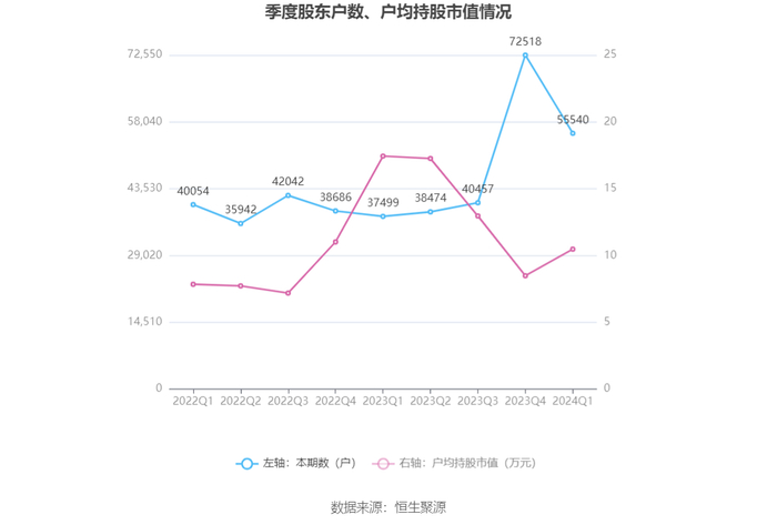 筹码集中度方面,截至2024年一季度末,公司股东总户数为5.55万户,较上年末下降了1.7万户,降幅23.41%;户均持股市值由上年末的8.48万元上升至10.47万元,增幅为23.47%。