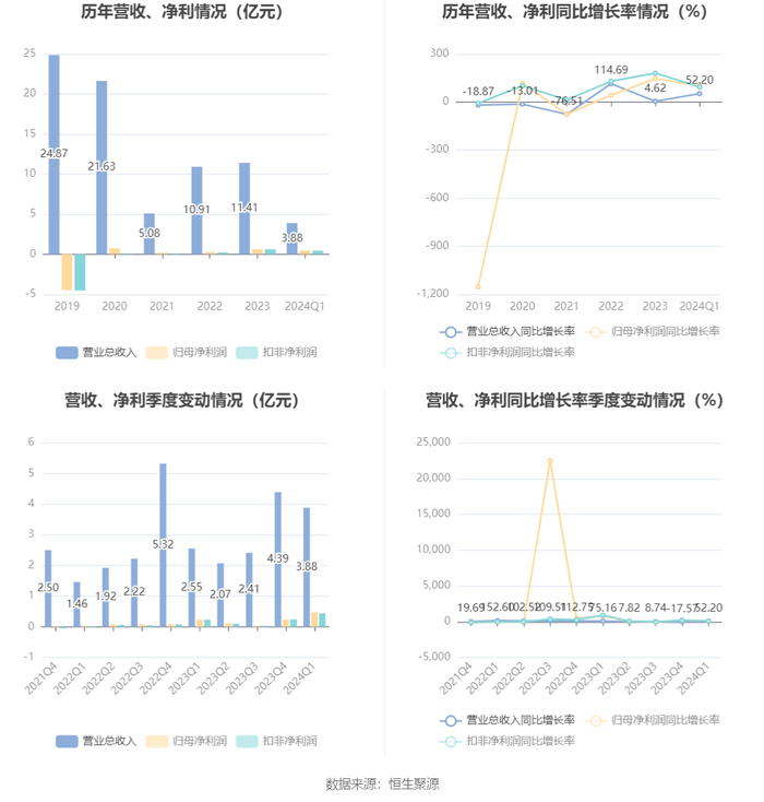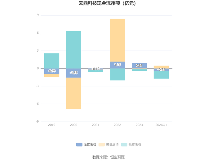 截至2024年一季度末,公司经营活动现金流净额为-4264.85万元,同比增加5375.06万元;筹资活动现金流净额4746.74万元,同比增加4746.74万元;投资活动现金流净额-1.29亿元,上年同期为-235.18万元。