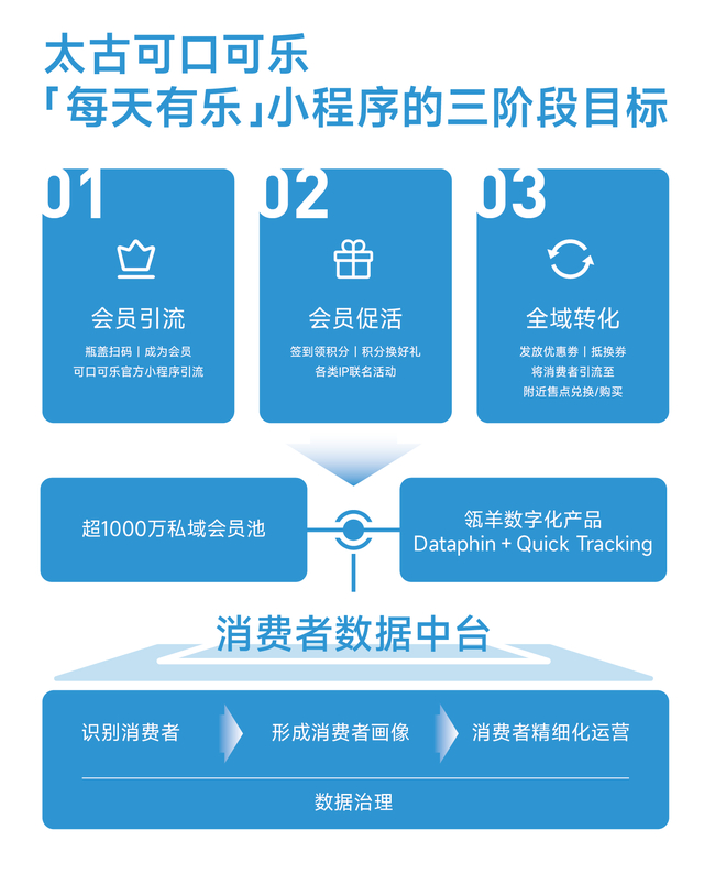 建设过程中太古可口可乐选择了数字化伙伴瓴羊。瓴羊是阿里巴巴全资子公司,致力于将阿里巴巴沉淀十余年的数字化服务经验,系统化、产品化地全面对外输出给千行百业。在与瓴羊合作后,太古可口可乐“每天有乐”小程序拥有了一个“三步走规划”,将逐步实现会员引流、促活和全域转化三大阶段性目标。