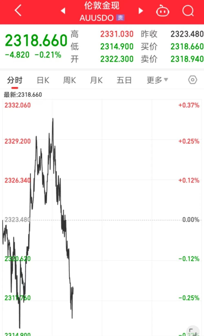 4月24日,国际金价延续此前两日下跌的走势,最新报价为2318.66美元/盎司,跌超0.2%。值得注意的是,伦敦金盘中一度跌至2314.9美元/盎司,但随后又迅速拉升重回2331美元/盎司。