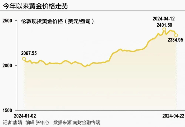 此前,国际黄金连涨五周,随后出现回调。4月22日国际金价重挫近3%,失守2350美元关口,创下去年2月以来最大单日跌幅。