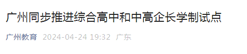 2021年10月,中共中央办公厅、国务院办公厅印发《关于推动现代职业教育高质量发展的意见》明确,探索发展以专项技能培养为主的特色综合高中。为完善现代职业教育体系,推动职普融通,优化职业教育类型定位,以及推进高中阶段育人方式改革,今年广州将秉持“试点推动、分批建设、分步推进”的原则,以公办中等职业学校为建设主体开展综合高中试点。经各区教育局申请、专家评审、市教育局审核等环节,最终确定在越秀、海珠、天河、花都、番禺等5个区的区属公办中职学校开展综合高中试点工作,分别是广州市贸易职业高级中学、广州市海珠工艺美术职业学校、广州市天河职业高级中学、广州市花都区职业技术学校、广州市番禺区新造职业技术学校,共计招生1100人。