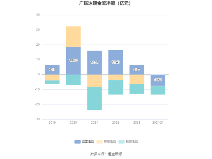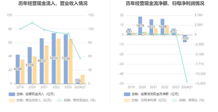 2024年第一季度,公司经营活动现金流净额为-7.50亿元,同比增加1.74亿元;筹资活动现金流净额-3742.40万元,同比减少4919.91万元;投资活动现金流净额-5.51亿元,上年同期为-5.2亿元。