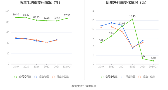 2024年第一季度,公司毛利率为87.58%,同比上升0.97个百分点;净利率为1.10%,较上年同期下降8.48个百分点。