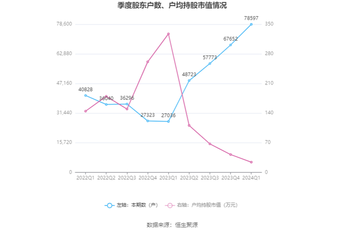 筹码集中度方面,截至2024年一季度末,公司股东总户数为7.86万户,较上年末增长了1.09万户,增幅16.18%;户均持股市值由上年末的42.18万元下降至24.15万元,降幅为42.75%。