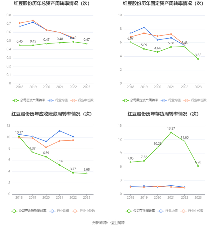 营运能力方面,2023年,公司公司总资产周转率为0.47次,上年同期为0.49次(2022年行业平均值为0.53次,公司位居同行业20/35);固定资产周转率为3.62次,上年同期为5.43次(2022年行业平均值为5.61次,公司位居同行业18/35);公司应收账款周转率、存货周转率分别为3.68次、6.20次。