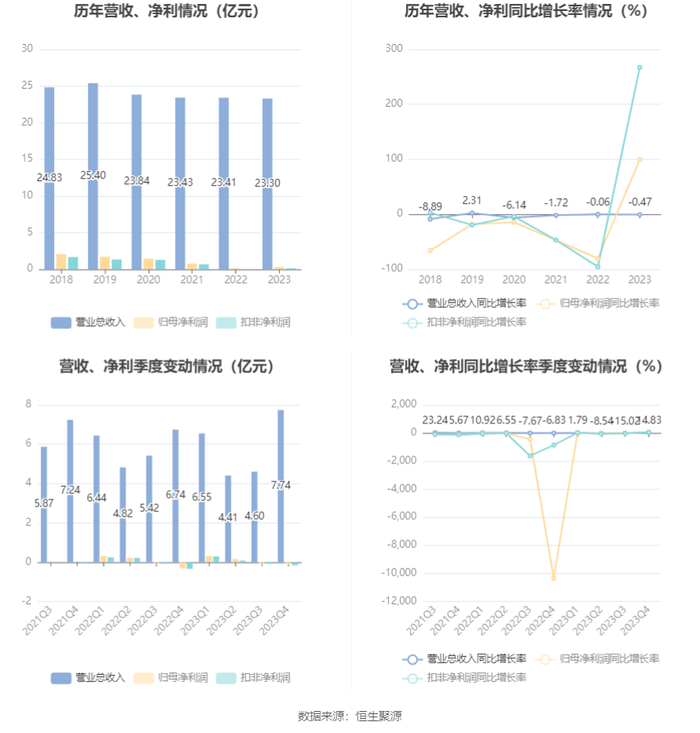 红豆股份(600400)4月25日披露2023年年报。2023年,公司实现营业总收入23.30亿元,同比下降0.47%;归母净利润3000.56万元,同比增长99.51%;扣非净利润1154.39万元,同比增长267.46%;经营活动产生的现金流量净额为4.22亿元,同比增长292.92%;报告期内,红豆股份基本每股收益为0.01元,加权平均净资产收益率为0.99%。公司2023年年度利润分配预案为:拟向全体股东每10股派0.1元(含税)。