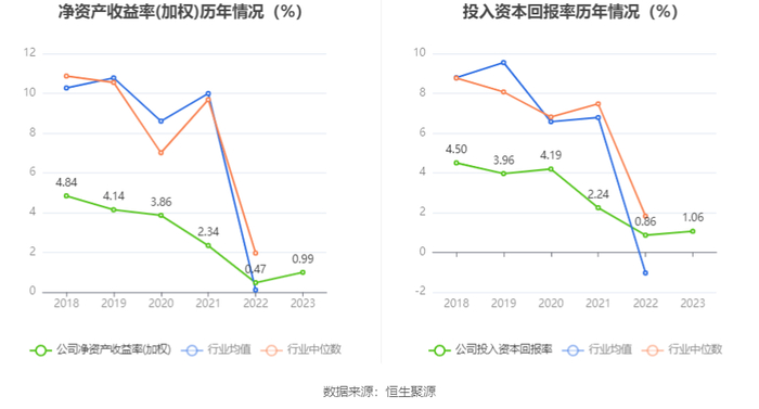 数据显示,2023年公司加权平均净资产收益率为0.99%,较上年同期增长0.52个百分点;公司2023年投入资本回报率为1.06%,较上年同期增长0.20个百分点。